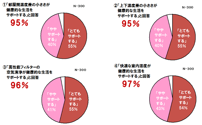 今回の調査で同時に実施した医師へのアンケートでは、(1)「部屋と部屋の温度差を小さくできることが健康的な生活をサポートできると思いますか?」という質問に対して95%が「そう思う」、(2)「室内の上下温度差を小さくできることが健康的な生活をサポートできると思いますか?」という質問に対して95%が「そう思う」、(3)「高性能フィルターで空気を清浄に保てることが健康的な生活をサポートできると思いますか?」という質問に対して96%が「そう思う」、(4)「室内の湿度を快適に保つことが健康的な生活をサポートできると思いますか?」という質問に対して97%が「そう思う」と回答しており、セキスイハイムの健康住宅実現への取り組みが医師の考えと一致していることで今回の高評価につながったものと考えられます。