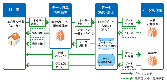 本事業ではその一環として、CO2排出量やエネルギー消費量を「見える化」することができるHEMSの普及促進と継続利用を促す自立的なシステムモデルの構築を行うとともに、HEMSデータの利活用について、その可能性を検証します。