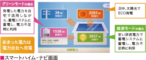 効果的に電気を使えるように、“創エネ” “省エネ” “蓄エネ”を見える化したコンサルティング型HEMS「スマートハイム・ナビ」が毎日の生活をサポート。パソコンやスマートフォンで気軽に閲覧でき、家族の節電意識が自然と高まると人気です。