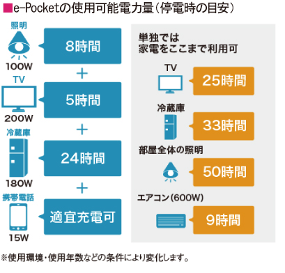 突然災害が起こったり、計画停電によって電力供給が途絶えた場合にも、自動で系統電力から蓄電池に切り替わり、電力が供給されます。5.53kWhの「e-Pocket(イーポケット)」なら最大1,500Wの電力使用が可能です。夜でも照明やTV、冷蔵庫などが使え、安心が続きます。