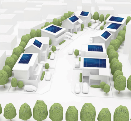 「スマートハイムシティ・プロジェクト」では、①大容量PV(4kW以上推奨)、②HEMS「スマートハイム・ナビ」③リチウムイオン蓄電池「e-Pocket」の搭載が基本となっています。これらを満たす「スマートハイムシティ」を今後積極的に供給することで、エネルギーの自給率を高める低炭素の環境性、光熱費ゼロ以下を目指す経済性、停電時にも電気が使える安心性が実現できるまちづくり、さらには、スマートハイムを全邸で繋いでいくことで全国規模のエネルギー管理を行う「スマートグリッド」社会構築への貢献を目指します。