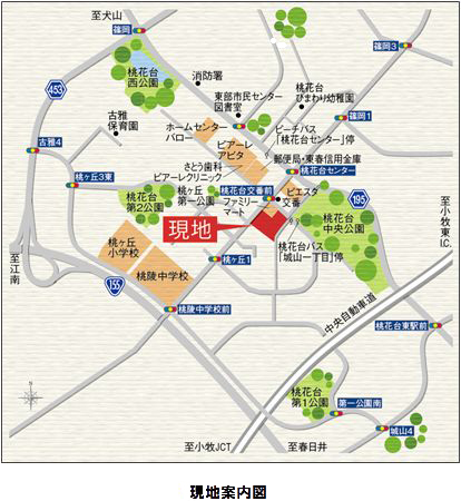 『スマートハイムシティ桃花台』は、桃花台ニュータウンの中心部に位置する同地区内における最終宅地分譲となります。スーパーや小中学校などの生活施設が徒歩圏内に揃う利便性と、「桃花台中央公園」に隣接した良好な住環境が特長であり、最寄りのバス停(徒歩3~5分)から路線バスで、名鉄小牧線「小牧駅」へは約23分、JR中央線「春日井駅」へは約26分でアクセスできます。さらに名古屋駅や栄に直接アクセスできる高速バス路線も運行されています。