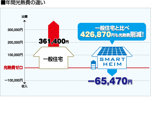 ※算出された光熱費はご家族の生活スタイルを推定して算出した予測値です。暮らし方や使用電化製品、生活スタイル、敷地の条件、地域周辺などの条件によって変わることがあります。※光熱費は平成24年7月の料金体系を用いて試算しています。エネルギー料金の変動によって光熱費も変動します。※売電に関しては「余剰電力買取制度」の平成25年度設置単価 38円/kWhを用いて計算しています。申込時期が異なると単価が変わることがあります。※年間光熱費シミュレーション条件[東広島市の気象データより試算]〈スマートハイム〉○商品タイプ:ハイムbj○オール電化(中国電力・ファミリータイムⅡ)○PV:南/4.95kW○蓄電システム:NEC5.53kWh○Q値:2.1○調理:電気○給湯:エコキュート○換気:第3種換気○冷暖房:エアコン○売電額[平成25年度設置単価]38円/kWh〈一般住宅〉○ガス併用(中国電力・従量電灯A/プロパンガス)○PV:なし○Q値:4.0○調理:ガス○給湯:ガス(一般給湯器)○換気:第3種換気○冷暖房:エアコン