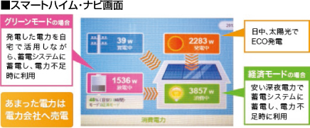 PVとセットで、システムの効果を最大限に活かし、家全体で省エネを実現するために、住まいのエネルギー(電力)を「見える化」するコンサルティング型HEMS「スマートハイム・ナビ」を搭載します。各居室やエアコンなどの使用電力をわかりやすく表示するとともに、コンサルティングサービス「スマートハイムFAN」と組み合わせることで、消費電力のムダを簡単に見つけ効果的で効率的な節電生活を送れるようにサポートします。