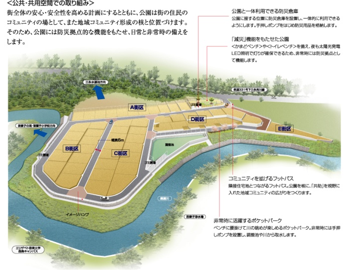 災害の中で特に大きな脅威と考えられるのが地震。中国地方においても「南海トラフ巨大地震」へのリスクが高まっています。大規模災害において、迅速な非難・救助活動や早期の復旧・復興のためのコミュニティの結束はとても重要です。そのための仕掛けの一つが「コミュニティグリーン」。住人の一人ひとりが緑を育てることを通して、街の人同士が気軽に声かけられ会話が生まれる環境をつくります。もう一つの仕掛けが「減災」機能をもたせた公園。日常的に人が集い街のコミュニティを育む機能をもち、さらに自治会活動による消火訓練や炊き出し訓練などを行うことで、「減災」や「共助」の意識を高めることができます。また、街の入口(外部との接点)に公園を配置し、隣接住宅地との間に歩行者専用道を設けることで、街コミュニティが地域コミュニティとして発展するように、その中で「共助」意識を共有し合う地域防災の拠点となるよう計画しています。