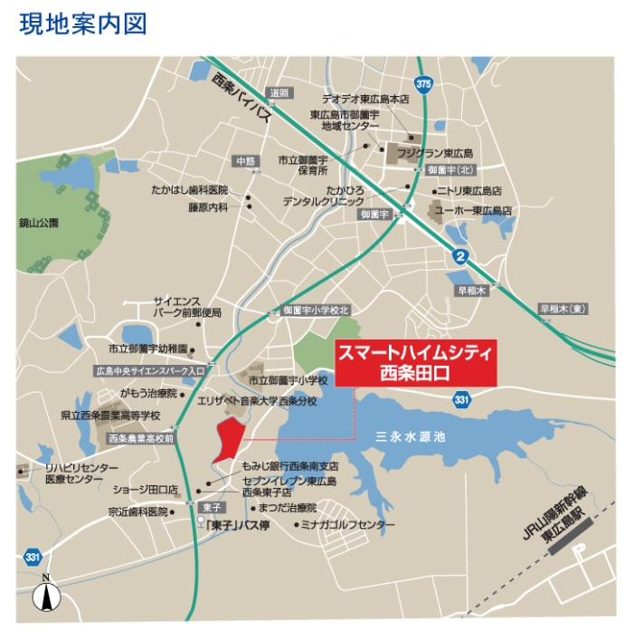『スマートハイムシティ西条田口』は東広島市の中央部、呉市水道局三永水源池の西側、吾妻子の滝からつながる黒瀬川沿いに位置しています。「水の郷百選」に選ばれた東広島市を象徴するような水と緑に包まれた潤いゆたかなロケーションです。また、御薗宇バイパス(国道375号線)、西条バイパス(国道2号線)にも近く、便利な交通ポジションにあります。