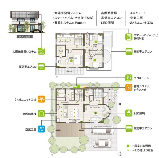 ・高効率エアコン、エコキュート、LED照明、空気工房(熱交換換気)の採用