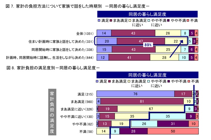 「住まい計画時」に新居での家計負担について家族で話をし、決めた家族の同居の暮らし満足度は89%。「同居開始時に話をして決めた」「計画時、同居開始時に話無し」家族と比べて満足度が高く、同居・二世帯の住まいづくりにおいて家計負担の仕方を考慮しておくことが重要であることがわかりました。