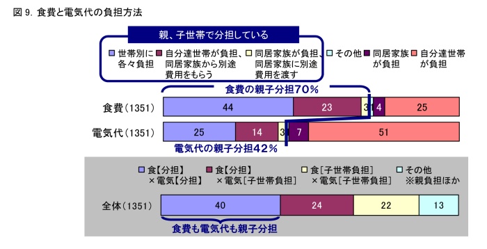 食費と電気代の負担の仕方をみてみると、親子分担をしている割合が電気代42%に対し、食費70%と食費を分担している割合の方が高くなっています。食費と電気代を合わせた負担の仕方では『食費も電気代も親子分担』しているが4割と最も多くなります。