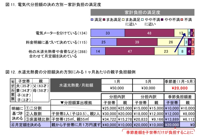 電気代分担額の決め方は『他の水道光熱費や食費などと合わせて月定額を決めている』よりも『料金明細に基づいて決めている』、さらには『メーターを分けている』方が家計負担の満足度は高くなります。電気料金は春秋と夏冬で季節差が、また例年に比べて猛暑や厳冬であったりすると年差が生じます。定額でやりとりをする場合、電気料金が高くなる月は親子の負担額に不公平が生じやすく、満足度が低くなることが考えられます。