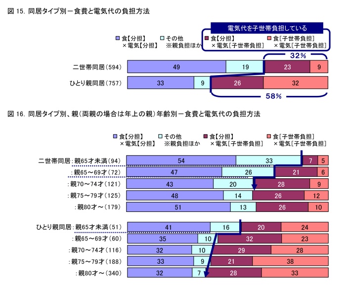 今回の調査では、同居・二世帯家族の家計は「親子で分担する」ほうが、また、食費だけ電気代だけではなく「食費も電気代も分担する」ほうが満足度が高い、ということが明らかになりました。同居・二世帯家族に同居の理由をたずねると「日常生活の上で経済的に助かるから」が上位に位置しています。調査結果から、同居のメリットとして家計を融通しあえることも期待されているということを改めて感じ取ることができました。