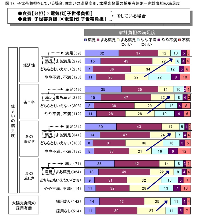 家計を分担したくても親が高齢などで出来ない場合があります。また、家を建ててしばらくは分担できていても親が退職し、年金生活に入るなどで家計が子世帯負担に変わる可能性もあります。『電気代を子世帯負担』している家族において、住まいの「経済性(光熱費や補修メンテナンス費がかからない)」「省エネ」「冬の暖かさ」「夏の涼しさ」満足度が高いほど、また太陽光発電の採用有無では「採用している」方が家計負担の満足度は高くなっていました。家計分担しない、できない場合はもちろんのこと、入居直後は分担予定でも今後単独負担に変わる時に備えて『光熱費のかからない住まいづくり』をしておくと家計負担および暮らしの『満足度』の維持、向上につながることが考えられます。
