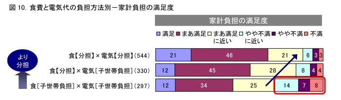 食費と電気代の負担の仕方は、親子分担をしている割合が電気代42%に対し、食費70%と食費を分担している割合の方が高くなっています。負担の仕方別の満足度では食費だけではなく『食費も電気代も親子分担』した方が満足度はより高くなります。
