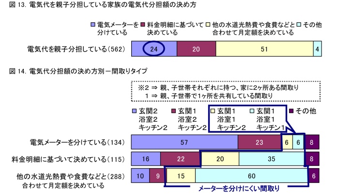 最も満足度の高い『メーターを分けている』は実態では電気代を分担している家族の24%にとどまり、『月定額を決めている』が決め方の主流となっています。背景として(ⅰ)親子共有型の間取りのため電気メーターを分けにくい(ⅱ)メーターを分けると基本料金が二重になるため、それを避けて1つにしているといったことが考えられます。メーターを分けない場合は漠然と分担額を決めるのではなく、新居入居後1年程度は水道光熱費の料金明細に基づいて、月ごとに分担額を算出することをおすすめします。その後、月定額を決めた場合には定期的に額を見直すことを親子間で決めておくこともポイントです。