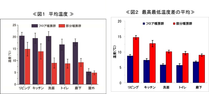 ・フロアー暖房群は、部分暖房群に比べ室内平均温度が6~11℃も高く、リヒ゛ンク゛と非居室(トイレ、廊下)との温度差は3~4℃。(図1)また最高・最低温度差の平均はリヒ゛ンク゛、キッチンでは8~7℃、非居室(トイレ、洗面脱衣、廊下)で6℃前後です。(図2)