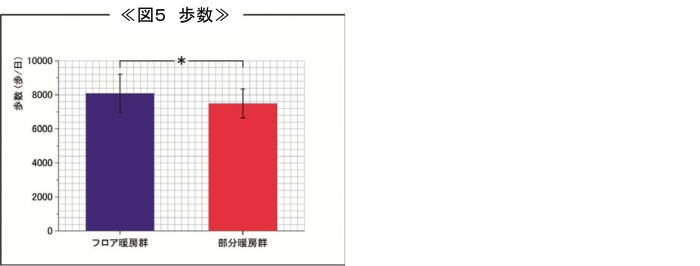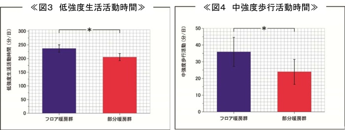フロアー各居室間の温度差が少なく快適な温度帯にあるフロアー暖房群の方が、部分暖房群より、低強度の生活活動、中強度歩行活動の時間が長く、歩数も多いことが明らかになり、これらには有意差が認められました。(p<0.05)※11