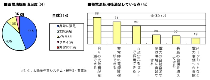 お客様の蓄電池に対する満足度を伺ったところ、「非常に満足」44%、「まあ満足」43%と、「満足」の合計が87%となりました。その理由としては、「月々の光熱費が削減できる」86%、「非常時の電源確保ができる」71%が突出しており、次いで「3点セットを採用できる」50%、「電力の自給自足で地球環境に貢献できる」29%、「最新の設備を導入できる」25%、「ピークカットなど電力事情への貢献」19%が続いていました。