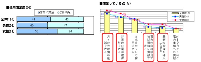 今回の調査では、蓄電池採用後の満足度は女性で「非常に満足」が多く、女性にとって魅力のある設備であることがわかりました。理由は「月々の光熱費が削減できる」で女性が95%(男性81%)、「非常時の電源確保ができる」についても女性が82%(男性66%)という数字となりました。これは一般的に女性が家計管理をすること、また冷蔵庫の管理や調理など家事を担うことが多いことなどから、「光熱費」や「非常時」の点での高い満足度につながっているものと思われます。