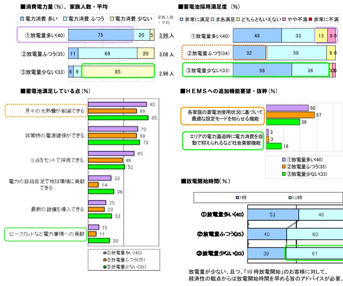 2)放電量がふつうのお客様(ほぼ使い切る日とたくさん余る日が混在している層)は、「非常に満足」「まあ満足」が9割に達していますが、満足している点では「月々の光熱費削減」のポイントがやや低い傾向が見られます。これは蓄電されている電力を使い切る日と余る日が混在しているためで、光熱費削減につながる上手な使い方を求めている様子がうかがえます。季節別、使用機器別など使用状況に基づいた「最適な放電開始時間」などのアドバイスが必要といえそうです。