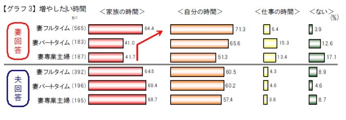 増やしたい時間は「自分の時間」と「家族の時間」。フルタイムママは「家族の時間を増やしたい」64.4%。パート、専業主婦のママに比べ、20ポイント以上も高い。