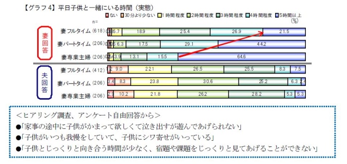 パパに比べるとママは子供と一緒にいる時間は長いものの、フルタイムママはパートママ、専業主婦に比べると平日は子供と一緒にいる時間が少ない。「5時間以上」は21.5%でパートママ44.2%、専業主婦64.6%に比べると少ない。