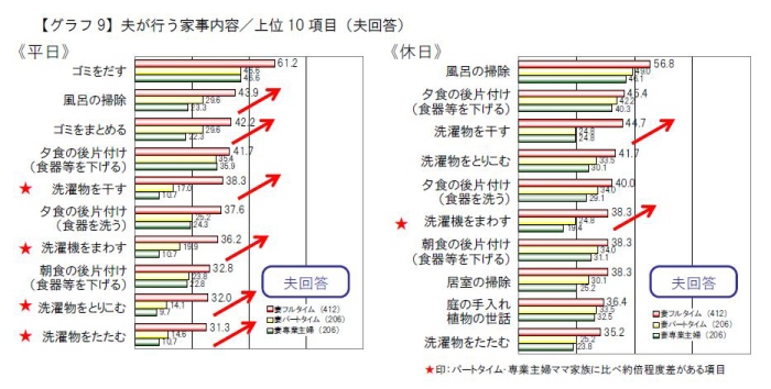 夫の平日の家事分担は「ゴミを出す」「風呂の掃除」「夕食の後片付け」、休日は、「風呂の掃除」「夕食の後片付け」「洗濯物を干す」など。フルタイム家族の夫は、他の家族の夫に比べると、<平日も家事をする><洗濯も行う>などの傾向がみられる。