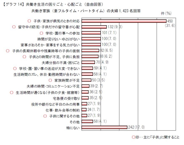 共働き家族(ママがフルタイム、パートタイム勤務をしている)の仕事と子育ての両立生活での困りごと・心配ごとは、<子供・家族が病気になったときの対応>が断トツ。次いで<留守中の防犯・子供だけの留守番が心配>、<子供の学校・園行事への参加>など。他にも、「送迎ができずに習い事ができない」「子供の夕食・就寝など生活時間が遅くなる」など、共働き家族の気がかりは、子供に関することが多い。