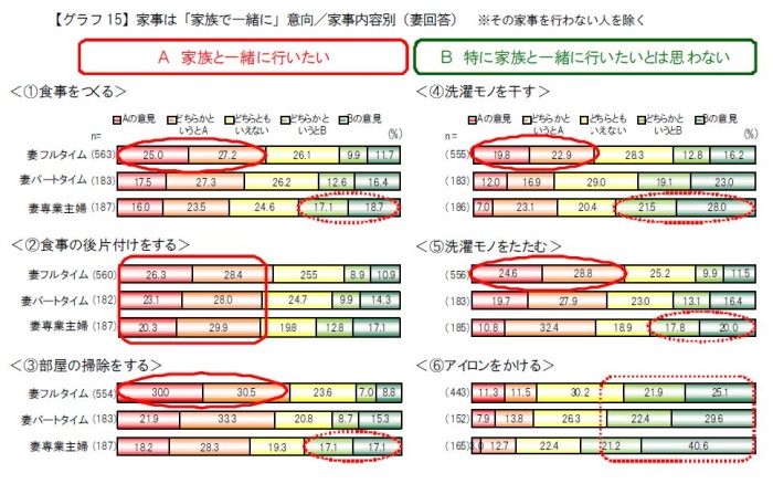フルタイムママは、<6アイロンかけ>以外は、「家族で一緒に行いたい」と思っている。専業主婦のママは、<2食事の後の片付け>以外は「特に家族と一緒に行いたいとは思わない」が3分の1以上を占める。