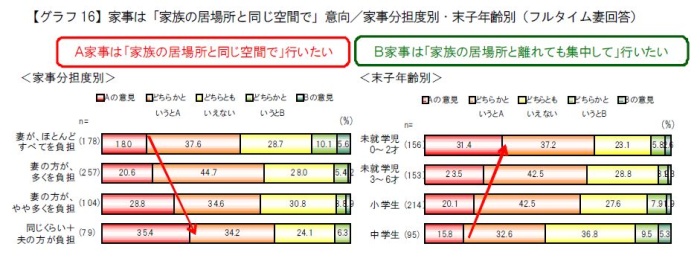 フルタイム家族でも、家事分担度が高いほど、末子年齢が低いほど、家事は「家族の居場所と同じ空間で」行いたい意向が高い。
