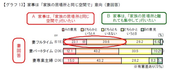 フルタイム家族は、家事は「家族みんなで一緒に」「家族の居場所と同じ空間で」行いたい意向がより高く、家族と一緒に行うオープンな家事スタイルを望む傾向。
