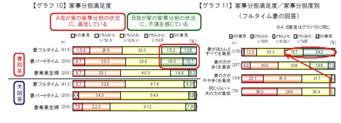 家事分担に対する満足度は、夫に比べ妻で、専業主婦ママに比べフルタイムママ・パートタイムママで不満がやや多い。意識と実態のズレが不満につながっていると思われる。 フルタイムママの回答を家族分担別にみると、「妻がほとんどすべてを負担」層では過半数が不満だが、「妻の方が多くを負担」層では不満は3割まで減少。