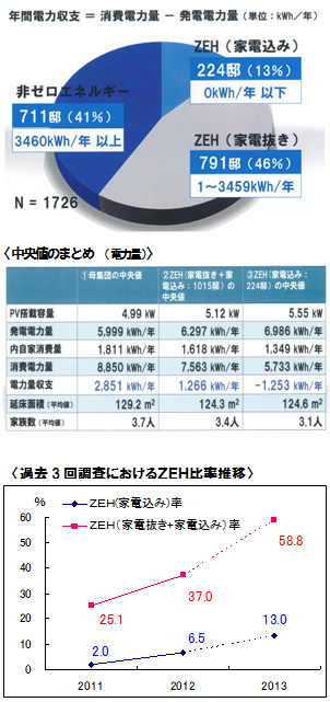 昨年実施した「光熱費実邸調査(2012)」ではZEH(家電込み)邸は調査した母集団の6.5%でしたが、今回の調査では224邸となり、全体の13%。その電力収支はマイナス1,253㎾h/年でした。なお、ZEH(家電抜き)791邸と併せるとZEH達成邸は母集団の約59%となります。