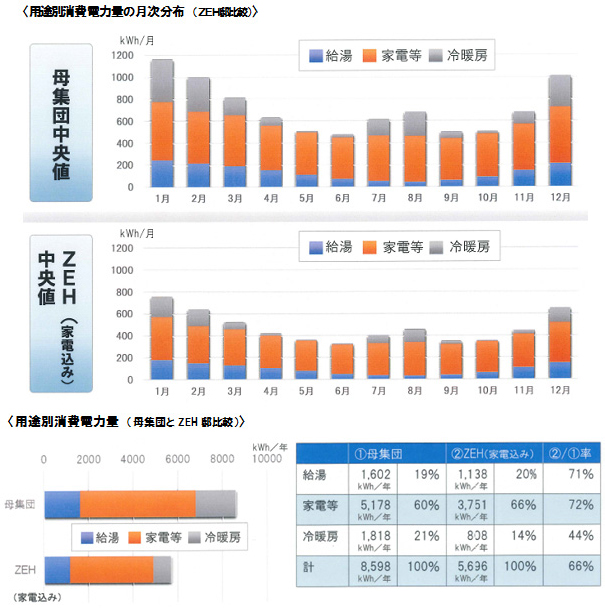 さらに、ZEH(家電込み)224邸の中央値(平均像)は延べ床面積124.6㎡で家族数は3.1人、PV搭載容量5.55㎾、発電電力量6,986㎾h/年、消費電力量5,733㎾h/年となり、電力量収支はマイナス1,253㎾h/年でした。
