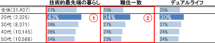 ■20代は「技術的最先端の暮らし」や「職住一致」に関心大