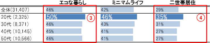 従来からある暮らし方に対しても、最も関心を示したのは20代でした。その中で最も関心が高かったのは「エコな暮らし」で、20代の50%、半数が関心を示すという結果となり、他世代を4~5pt上回りました(表中③)。また、「二世帯居住」では20代は35%で、他世代より4~8pt高いなど、世代間比較において顕著な差が見られました(表中④)。