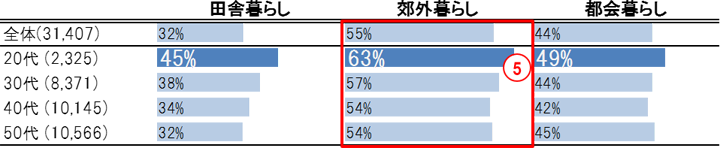 「郊外暮らし」は全体で55%、どの世代においても最も高い結果が出ました。特に20代にその傾向が強く、63%が “してみたい”と回答しました(表中⑤)。同時に他の場所に対しても20代が最も高い結果となっており、20代は様々な場所に対して暮らしてみたいと考えていることがわかりました。