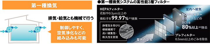 | ※5 | 花粉粒径は10μm以上を想定、大気塵0.3~0.5μmの捕集率測定結果(東レ㈱調べ)。数値は、お引渡し時のフィルター初期性能を示しています。お客様の使用する環境等の条件によっては下回る場合があります。フィルターは性能を確保するために5年に1度(目安)の交換(有償)が必要です。数値は、お客様の使用する環境等の条件によっては下回る場合があります。花粉症・呼吸器疾患などの治療や改善を目的とするものではありません。 |