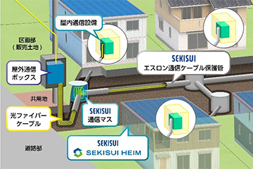 また、リードタウンの共用地には専用の屋外通信ボックスを設置。屋外通信ボックスから各住戸まで光ファイバーケーブルを通す管路には、積水化学グループの製品である「エスロン通信ケーブル保護管」等を利用し地中に埋設することで、災害に強く安全性・信頼性の高い、レジリエンスな通信インフラを実現します。