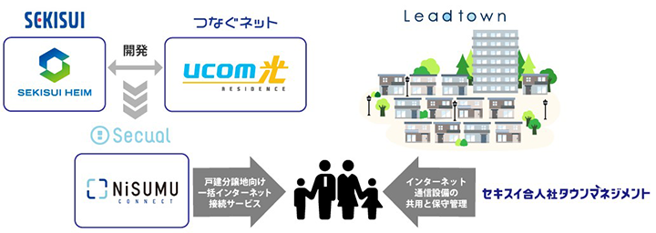 今回、リードタウンをはじめとする分譲地の管理ノウハウと実績を持つセキスイ合人社タウンマネジメント株式会社がまち全体を管理し、通信設備の共用と保守管理を行うとともに、ISP※2であるSecualと一括契約を締結することにより、戸建分譲地での全戸一括加入提供方式を実現しました。