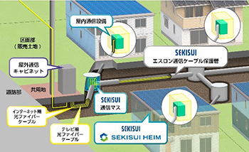 この度、積水化学グループのインフラ技術、分譲地開発・管理のノウハウと、ギガプライズの通信技術、スカパーJSATの放送設備・光回線を活用した映像配信のノウハウを融合することで、戸建分譲地で初めて光回線による全戸一括インターネット接続およびテレビ視聴サービス※1の提供が実現可能となりました。