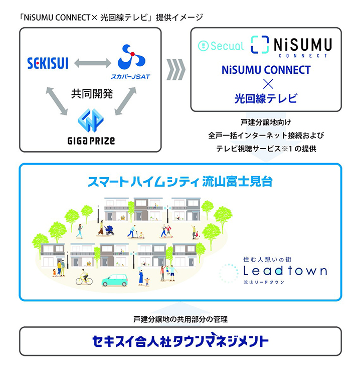 積水化学工業株式会社 住宅カンパニー(プレジデント:神吉利幸、以下「積水化学」)、株式会社ギガプライズ(代表取締役社長:佐藤寿洋、以下「ギガプライズ」)、スカパーJSAT株式会社(代表取締役執行役員社長:米倉英一、以下「スカパーJSAT」)、株式会社Secual(代表取締役CEO:菊池正和、以下「Secual」)は、戸建分譲地向け全戸一括インターネット接続およびテレビ視聴サービス※1「NiSUMU CONNECT(ニスム コネクト)×光回線テレビ」を開発し、積水化学が展開する大規模分譲地「流山リードタウン」内の戸建分譲街区「スマートハイムシティ流山富士見台」(以下「SHC流山富士見台」)で提供を開始します。