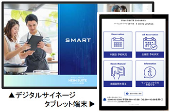 今回新たに、共用施設向けアプリ「Plus SUITEコンシェルジュ」を開発。各共用施設に設置した専用タブレット端末とエントランスホールのデジタルサイネージから、共用施設の予約状況や共用施設の使い方、マンションからのお知らせなど、必要な情報を必要な場所でスマートに確認することができます。