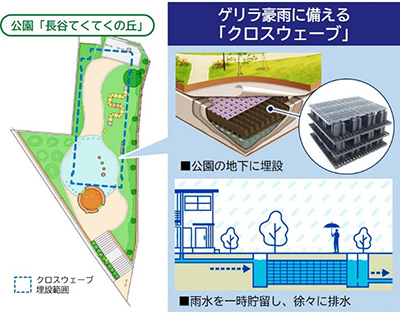 戸建住宅には太陽光発電システム、蓄電池、HEMSを全邸搭載し、環境にやさしく電気代高騰に左右されにくいエネルギー自給自足型※3のスマートな暮らしを目指します。また、ゲリラ豪雨に備える雨水貯留システムや耐震性・耐久性に優れた給排水管、通信管など、災害に強い当社グループのインフラ技術で基盤を整備し、まち全体で災害時のレジリエンスも備えます。