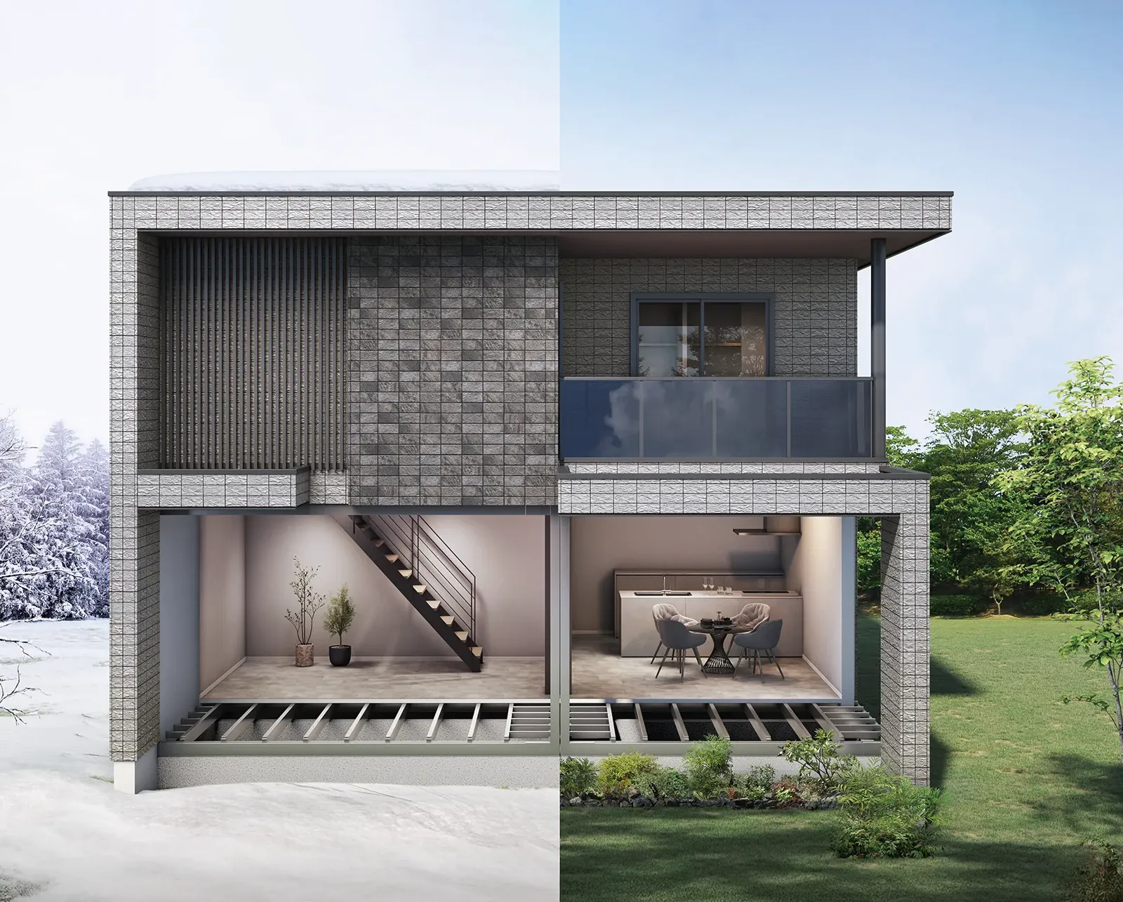 住まいの断熱性のレベルをクラス分けした「断熱等性能等級(以下断熱等級)」において、ELVIAは等級6※3に対応可能。今、そして将来に求められる断熱レベルを現段階で超えた断熱性能は、一年じゅう快適な暮らしには不可欠です。