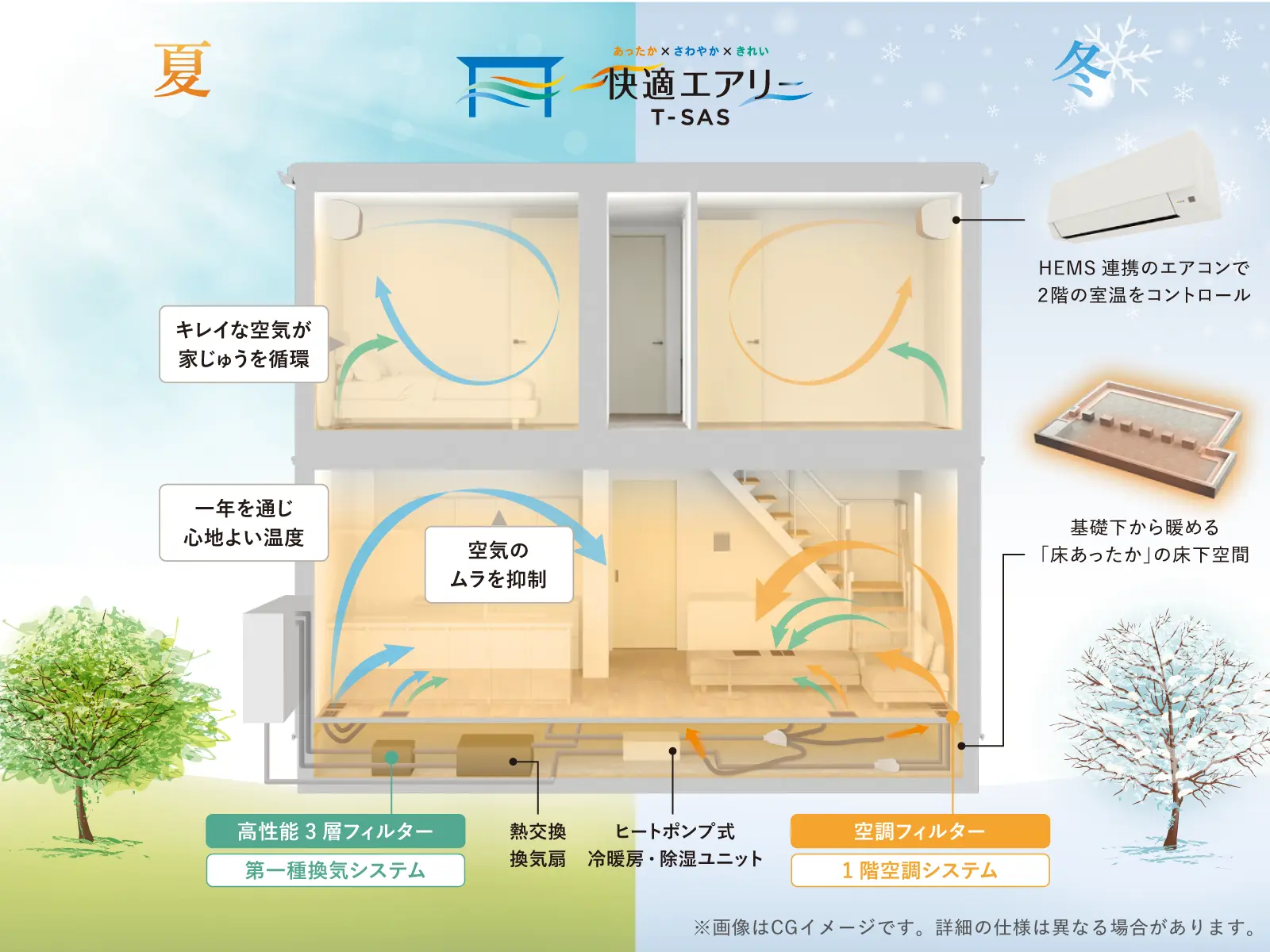 ●HEMSに連携するエアコンを設置しない部屋は、HEMSによるコントロールの対象外です。 - 寒冷地を除く省エネ地域区分5~7地域(主に仙台以南から鹿児島までの温暖地)における標準化。プランや一部採用メニュー等の条件によっては、断熱等級6に適合しない場合があります。