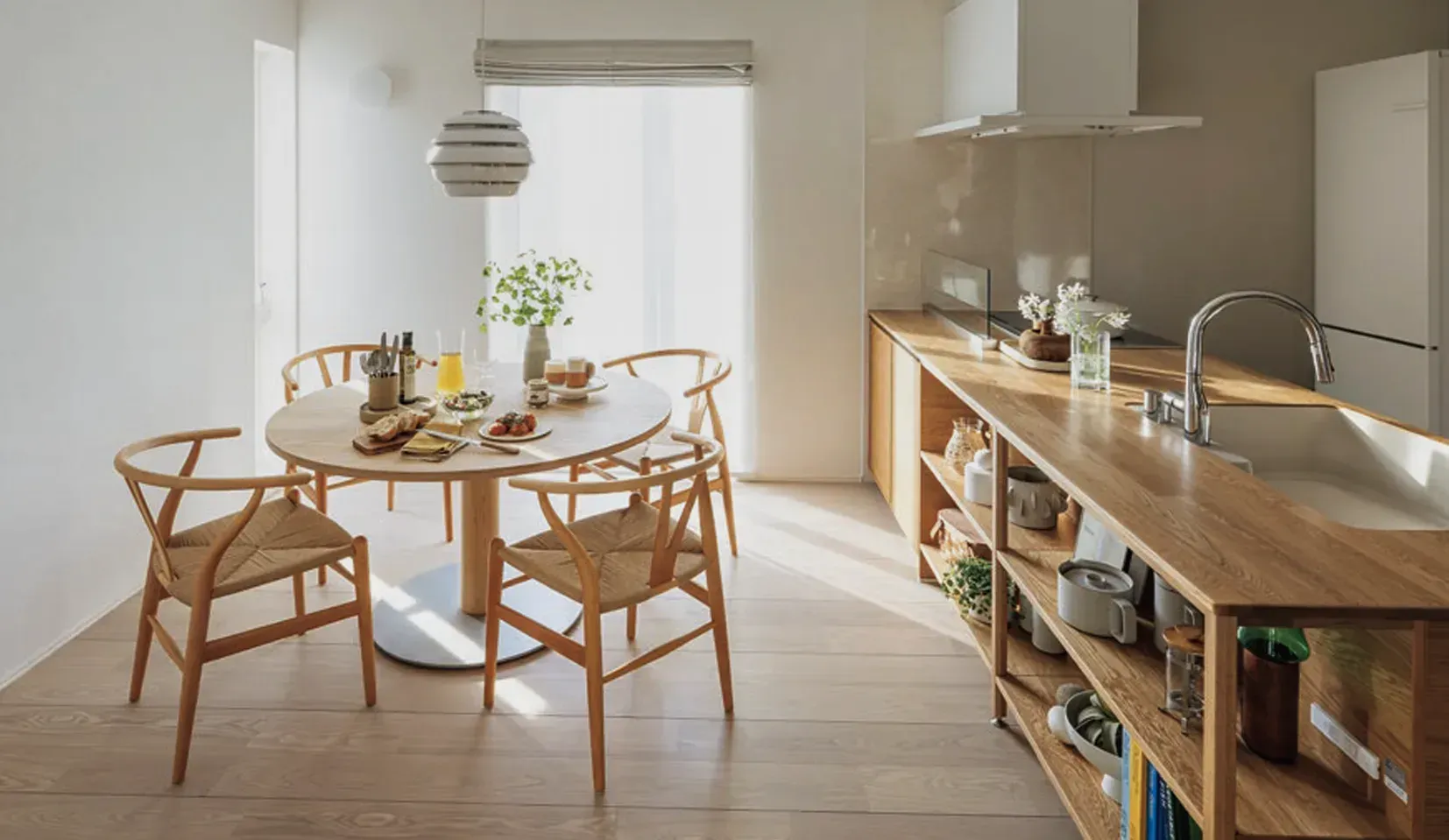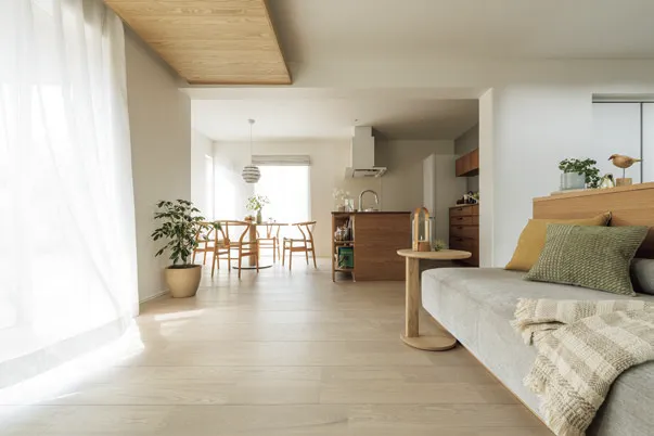 リビングとダイニングキッチンが、近すぎず遠すぎない距離感でつながるLDK。家族それぞれの時間も、一緒に過ごす時間も大切にできる空間です。南面の大開口から光と風を招き、明るく開放的な心地よさを生み出します。