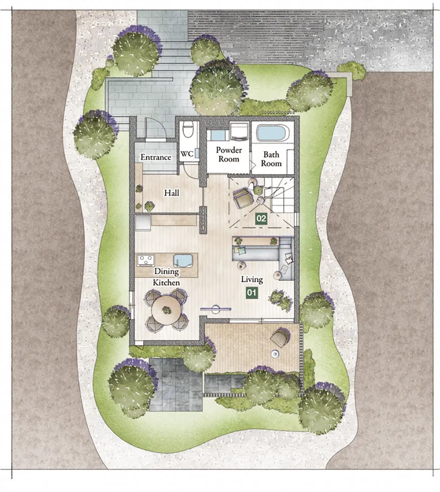 1Fの快適エアリーと2FのHEMS連携エアコンで、心地よい室温に※2。さらに、断熱等級6を標準※3とした高断熱仕様で、住まい全体の快適性を向上。季節を問わず心地よい住まいを実現します。
