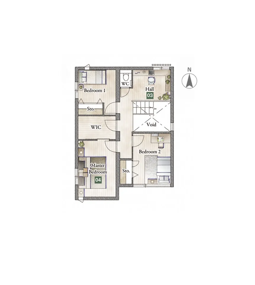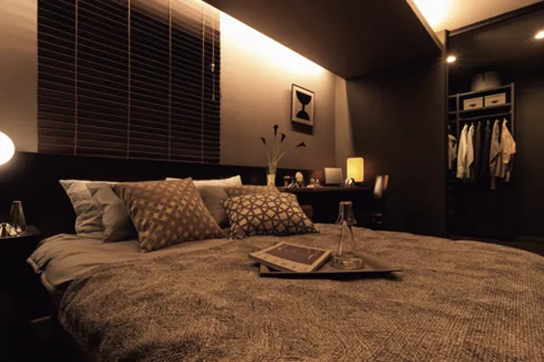 壁面をやわらかく照らすコーニス照明が、心地よい主寝室。ドレッサーとW.I.C を併設し、夜のスキンケアから翌日の準備、朝の身支度までをスムーズに。日々のリズムを整える設計です。