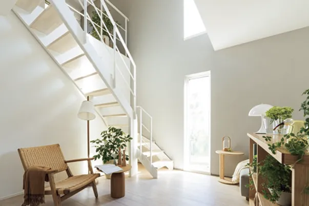 縦に視線が抜ける吹き抜けとオープン階段の下に設えた読書コーナー。東面の窓から差し込む朝陽に包まれながら、お気に入りのチェアで本を読む、朝の習慣。向かいの書棚から次の一冊を選ぶ、静かで満ち足りた時間が流れます。