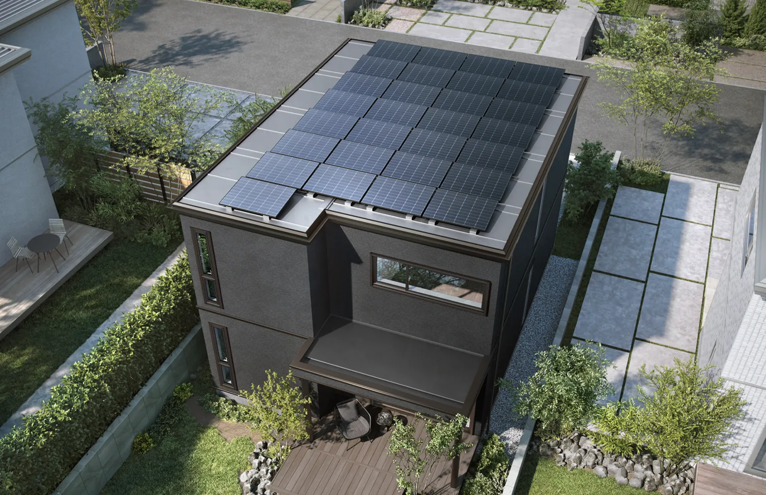 フラット屋根は、建築方位やパネル配置の制約が少なく、同じ敷地条件でも効率的にソーラーパネルが載せられます。当社の傾斜屋根商品よりも積載量が向上し、より多くの発電を可能にします。